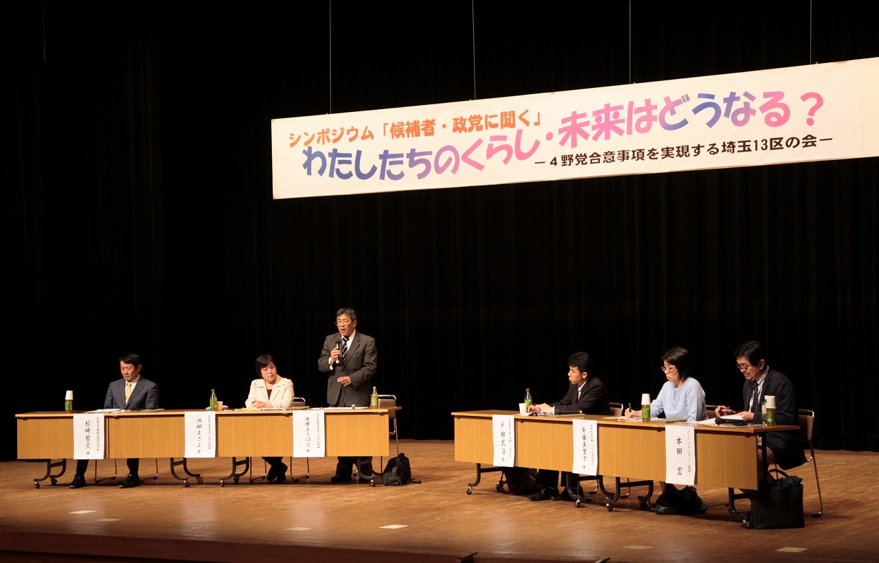 ニュース 2017/05/20 埼玉13区の会シンポジュウム 「4野党合意事項を実現する埼玉13区の会」は4月28日夜、春日部市で「候補者・政党に聞くシンポジュウム~私たちの暮らし・未来はどうなる」を開き、130人が参加しました。 次期衆議院選挙で埼玉13区から立候補を表明している、日本共産党の赤岸雅治、社民党の池田万佐代両氏と、自由党県連代表の松崎哲久氏が出席。野党共闘の成功や、差し迫った「共謀罪」法案の成立阻止のたたかいに全力をあげる決意を表明しました。 赤岸氏は、うそと偽りでつくられた安倍政権の虚構の政権が、国民運動により窮地に追い込まれていると指摘し、「安倍政権を倒すまであきらめずに声をあげよう」と呼びかけました。 民進党は同区候補の三角創太氏がメッセージを寄せ、野党共闘の重要性を強調しました。 シンポジュウムは、本田宏医師をコーディネーターに、3党の代表とともに市民代表の女性と青年が議論しました。女性が「(安倍政権の)危険な政策を人に話しても引かれてしまう」と話すと、本田医師は「(政治に対して)その人が怒りを持っている事を話題に、対話をすればいいのではないか」と述べました。 (しんぶん赤旗、5月3日付け掲載記事から)